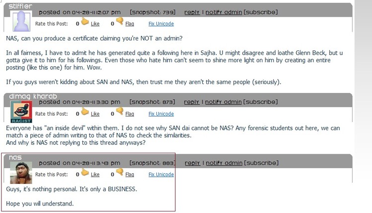 But, Lurey, San and Nas have left some room to doubt that they are the same person with different ids. I just checked this thread and noticed that San posted something in this thread, followed by Lurey defending that Nas and San are of two different persons and that he knows both of them, and interesting thing is that the time gap is just of 2-3 minutes between two postings. It seems like San posted and logged out and immediately logged in with the id of "Lurey" and wrote some lines defending his arguments for about 2 mintues and posted.