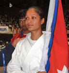 कति खानी मात्रै कुरा गर्न सकेका होलान् यिनीहरुले. ल नमेको झण्डाले काम गर्दैछ है. --- --- --- Fourth Gold for Nepal in SAG Sulochana Sijakhwa wins the fourth gold medal for Nepal. (Photo source: Bikram Thapa) Sulochana Sijakhwa won Nepal a fourth Gold in the female Individual Kata of Karate, beating Sri Lanka by 4-1 points in the final bout here at Sugathdasa Indoor Stadium in Sri Lanka Wednesday. Earlier, Sijakhwa defeated Zohra Akhtar of Afghanistan by 3-0, and Jaw V Prue of Bangladesh with same margin. Chief-de-mission and Member Secretary of National Sports Council greeted Shijakwa for her victory during a ceremony following the match.