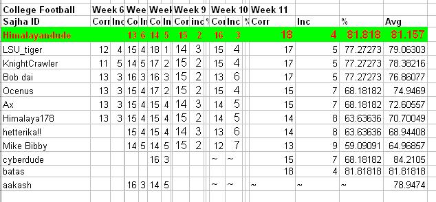 Oh...what a week!!....i dinn expect that much of upsets...it was just amazing.. We now have an interesting situation for the BCS championship and BCS bowl games. Here is the predictions result for the week..Himalayandude has left everybody behind this week.