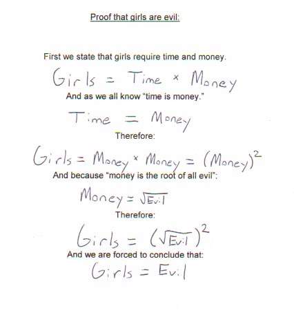 Raising any value to power of 2 gives absolute value. There fore, girl = (sqrt(evil)) raise to the power of 2 girl = absolutely evil p.s: continuation of mathematical proof in first post.