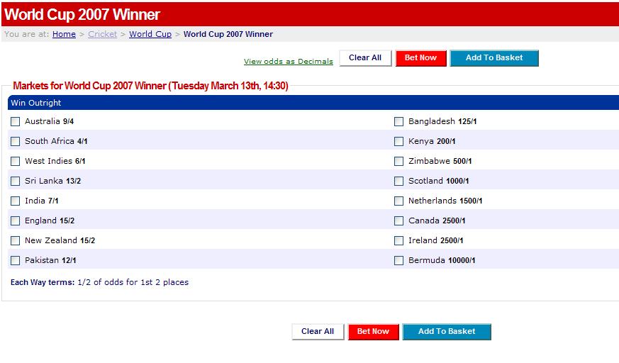 Odds are still in favor of australia . followed by south africa and westindies. I will go for westindies. I have alreay put £10 for the windies. Go windies go. http://www.skybet.com/skybet?action=GoEvEv&id=10720729