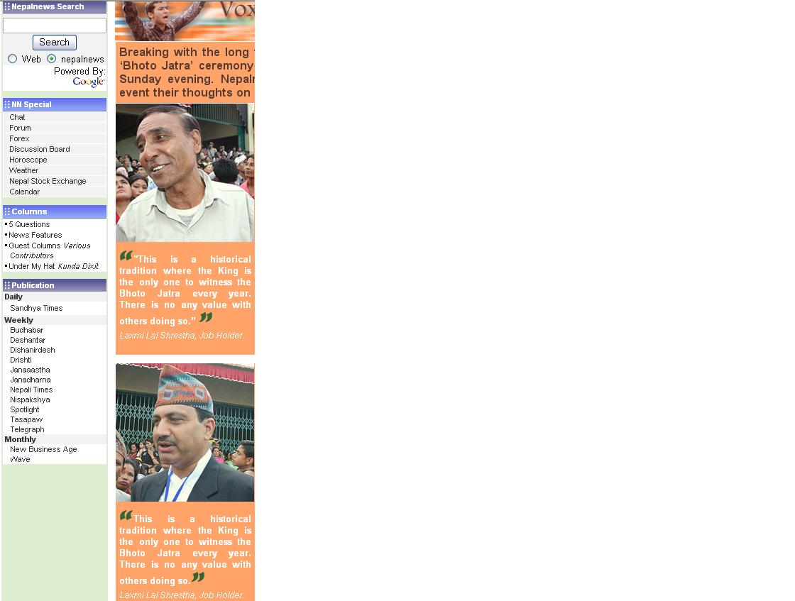 In fact, neither I am racist..... but really speaking, it was supposed to be shown by a Newar.... (by the way guys, you didn't notice the BLUNDER of Nepalnews....) http://www.nepalnews.com.np/inner.php?cat=voxpop&dir=2007/07&file=vox_02.php ***************************** see the comments of the person in the FIRST picture and that of the one who showed bhoto.... *********************** In fact, Laxmi Lal Shr. seems to be the first one....Not the one who showed bhoto... (It is a stupid blunder of nepalnews guys) *********************************