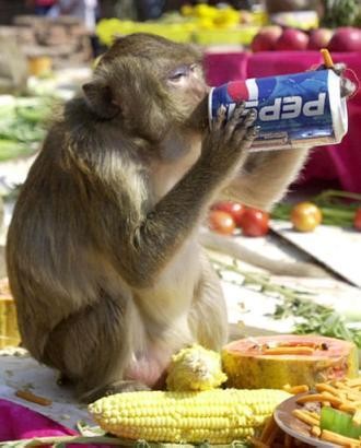 Well to go in much detail; that mokey hasn't forgotten to munch some snack with his drink as well. Look in his left hand.