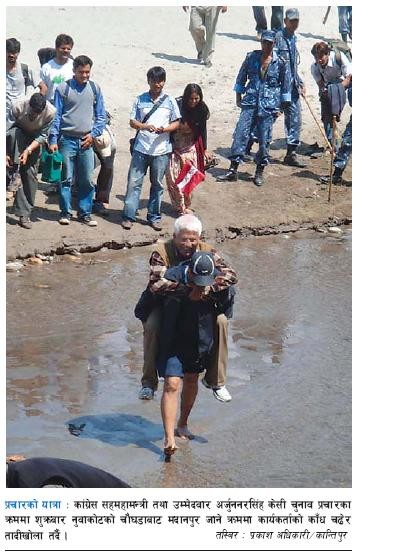 Ha Ha Ha, this is a funny photograph, Mr. Prachada aka wannabe president of Nepal is in leather shoes, shining dress up and well kept hair, who is carried on back by someone while crossing a river that has merely below-knee water level. How much unsecure he feels with such a low depth river?